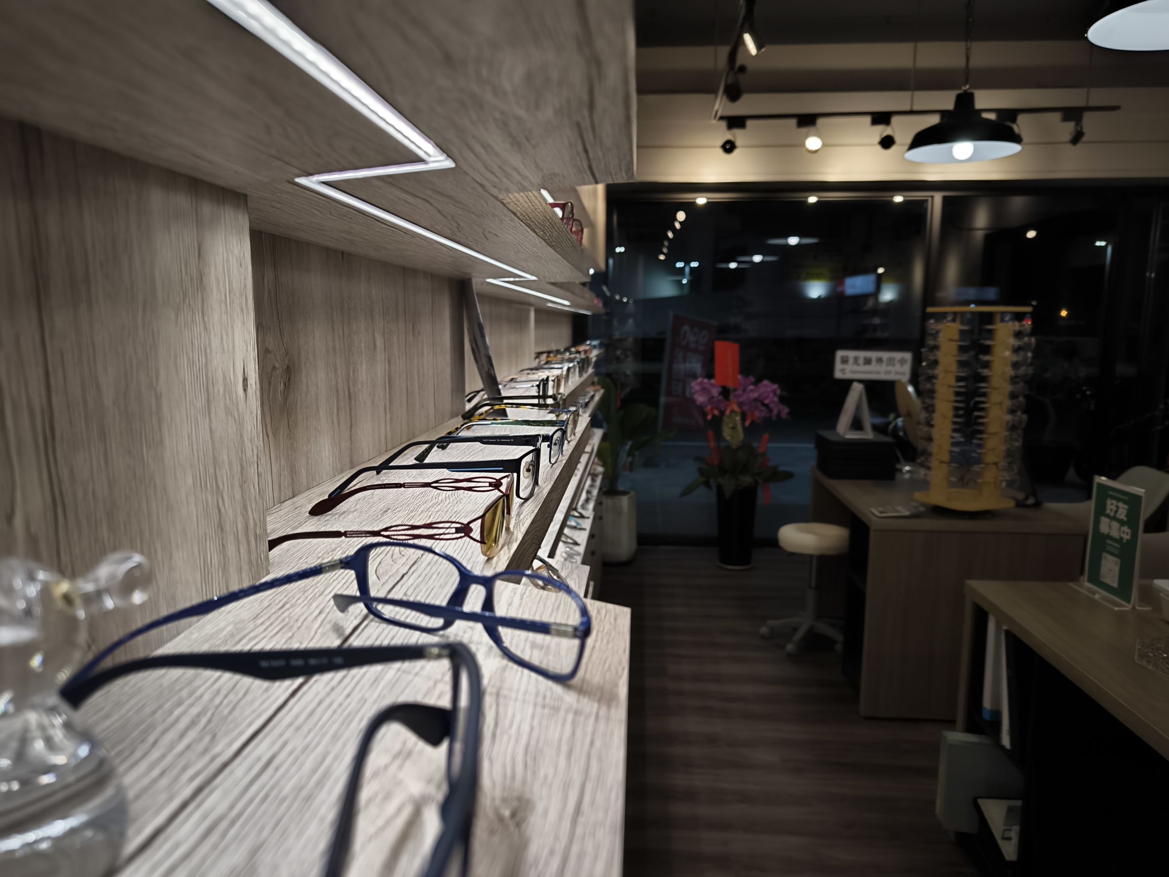 木質家具與暖黃燈光中和了冷硬感,使整體氛圍更親切、舒適,適合長時間挑選與配鏡。