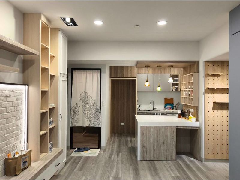 木質櫃體與展示層板:選用淺色木紋,增加空間的溫度感,避免工業風過於冷冽。